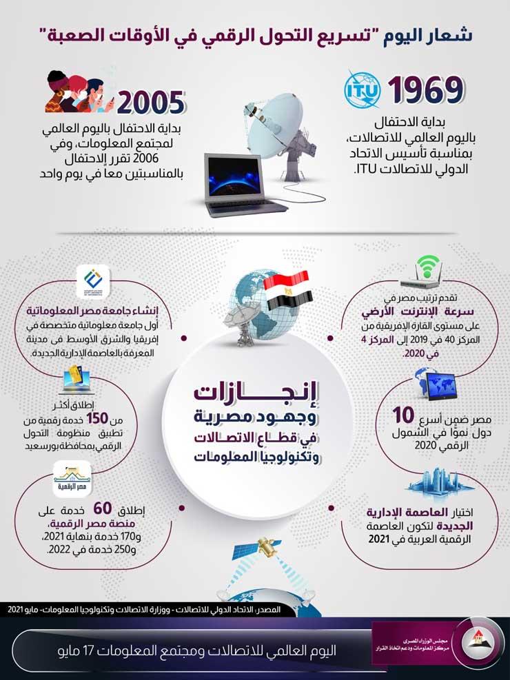 نشر مركز المعلومات ودعم اتخاذ القرار بمجلس الوزراء إنفوجرافيك في إطار الاحتفال باليوم العالمي للاتصالات ومجتمع المعلومات 2021 تحت شعار “تسريع التحول الرقمي في الأوقات الصعبة”.